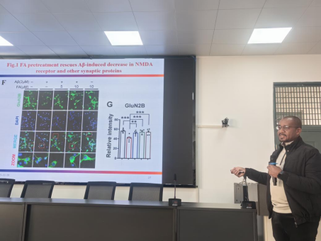 杨林教授从研究背景、提出科学问题、实验方法、实验结果、结论这五个方面全英文讲授,层层递进深入阐述阿魏酸通过减轻PP2B/DARP-32/PP1轴介导的STEP增加和Aβ负担,从而改善阿尔茨海默病的突触可塑性和认知障碍。报告内容丰富多彩,浅显易懂,引起师生的深厚兴趣,邹丽梅、黄盛、许佳青等博士教师积极交流探讨,学生也纷纷向杨林教授请教,报告会气氛活跃。