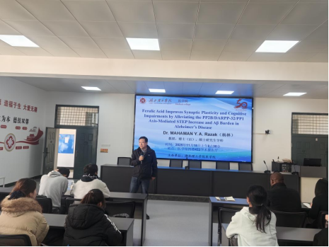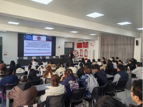 本网消息 11月18日上午,外籍教授Dr. MAHAMAN Y. A. Razak(杨林)在医学院四楼报告厅为医学院师生作学术报告,医学院院长苏振宏、副院长方迎艳、部分博士教师以及医学院2023级临床医学本科生近50余人参加交流学习。