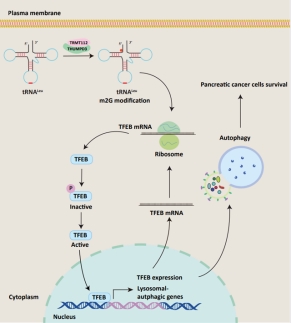胰腺癌是恶性程度最高的消化系统肿瘤之一,自噬是维持胰腺癌细胞恶性表型的关键过程,但其与tRNA甲基化修饰之间的功能联系此前尚不明确。本研究首次证实,THUMPD3-TRMT112复合物在胰腺癌恶性进展中发挥关键作用:敲低THUMPD3-TRMT112可显著抑制胰腺癌细胞的自噬水平,同时削弱其增殖、侵袭等恶性表型。THUMPD3-TRMT112复合物通过介导tRNALeu(CAG)的甲基化修饰,增强自噬关键转录因子TFEB的翻译效率,进而驱动胰腺癌细胞的自噬与增殖。进一步研究证实,THUMPD3-TRMT112介导的tRNALeu(CAG)m2G修饰是增强TFEB翻译效率的关键机制。